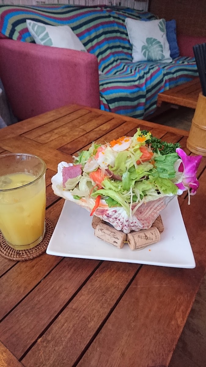 Virgin Sunset is known for its creative and fresh menu, which features an exciting selection of dishes, each with its own distinctive flavors. One standout item on the menu is the Hawaiian Salad, a vibrant mix of fresh greens and tropical fruits that offer a refreshing start to any meal. For those who enjoy bold flavors, the ジャークチキン (jerk chicken) is a must-try - perfectly seasoned and grilled to tender perfection, it’s a savory dish that leaves a lasting impression.